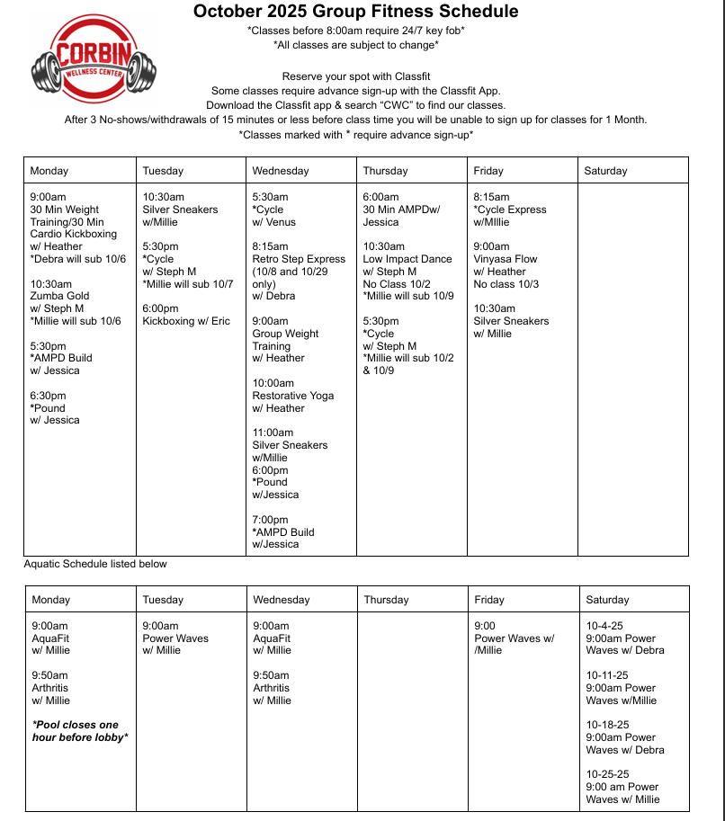 Here at Corbin Wellness Center, we offer a wide variety of classes to ensure that there's something for everyone. Classes are included in your membership or just $7 for guests.